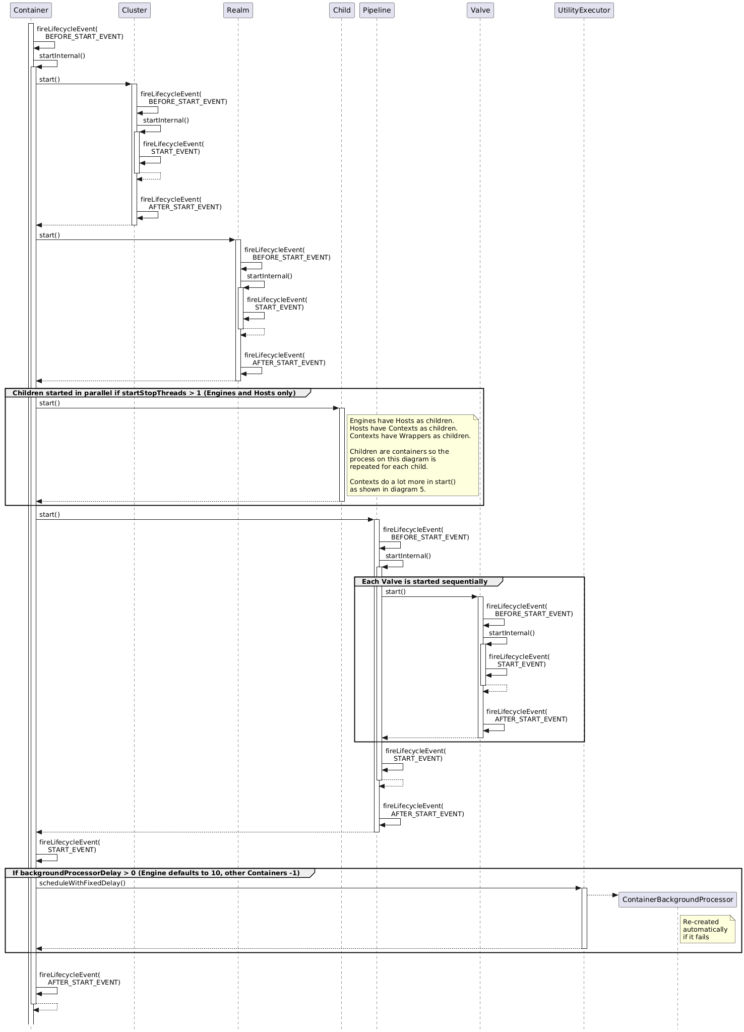 Diagram 4 shows how Containers (Engines, Hosts, Contexts and Wrappers) start along with any supporting Clusters, Realms and Valves.